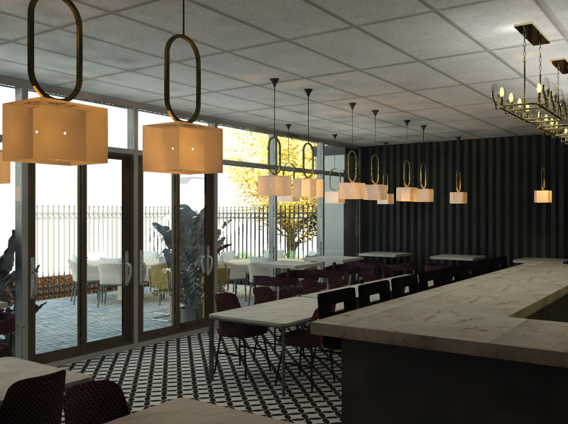 For this commercial project, we were given the building shell of the restaurant and were to create a restaurant which was located in France. Our requirements were to include a commercial kitchen, two bathrooms, a private dining space, bar, along with the general seating. This project was the first-time using REVIT to render our designs.